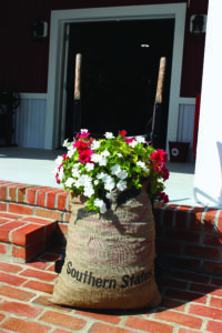 A Southern State’s feed sack now holds flowers as it rests against a hand cart by the steps. Same for the pitcher pump wash stand, hog scalder and cauldron hanging from a tripod all things his his family once used to butcher pigs. Each now houses colorful plant life.